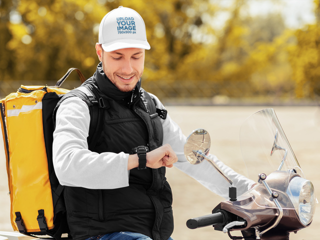 Placeit Dad Hat Mockup of a Delivery Man on His Scooter from placeit.net